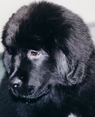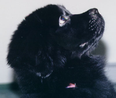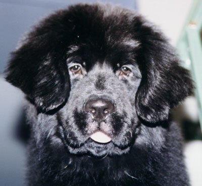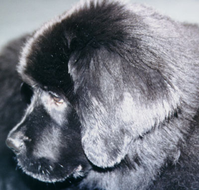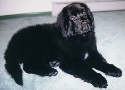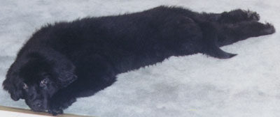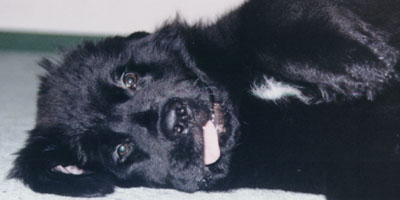 Our inquisitive beastie wondering "Why does Daddy have a black box in front of my face and more importantly; is it edible?" Look... I'm sitting. I get a cookie when I sit Right? The ever angelic Cosette ponders the deeper points of Newfdom. We figure these points are something like: "If I only had thumbs, I could get the damn food by myself." and "Let's see... biting fingers is good and biting toys is bad... No, no that's not it... Biting ears is good... No no..." OK, I didn't get the cookie when I sat, so the next thing you always say is "down". Look, I'm down like a good girl. Do I get a cookie now? Do I? Huh? Oh Puuuhhhhllleeessssseeee can I have a cookie? What can you say to a face like this? Needless to say, she gets cookies when she's a good girl. And belly rubs, and kisses, and hugs and ear scritches. Nothing beats the sound Cozy makes when you rub her ears just right. After cookies nothing is better than belly rubs and raspberries on my tum, as is evidenced by this post-rasberry snapshot. After exhausting the cookie induced energy spurt, nothing beats a complete stretching of the Newfie body. And what a body it's becoming. Nice rug, No? Here we are at the end of this batch of Cozy pictures. Couldn't end without the classic Newfie-bifocal-stare now could we? So long for now... Thus endeth this installment of the Newf puppy page. Cosette's Home Page Back to the World of GAD Be Well, Be Strong.