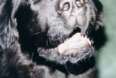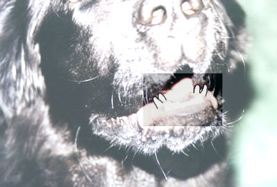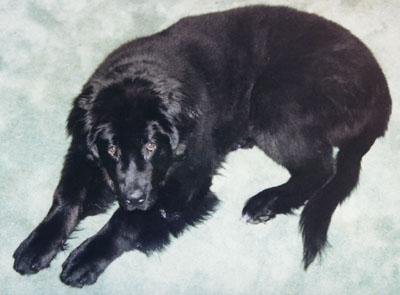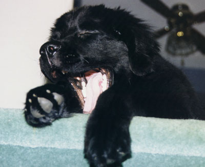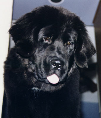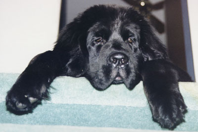 What an angel. This would be the "cute face" that gets her way too many cookies. OK, these pictures are weird, I know. Look at her teeth. She has two complete sets of canine teeth (fangs), and I just think it's the coolest thing ever. The highlite on the second picture should help you pick them out in the first. A crummy picture, yes, but I wasted almost a whole roll trying to get her to show those damn teeth! Pretty cool huh? Cozy sits on the top of the stairs, looking down on all her royal subjects. When Mommy is upstairs, and Daddy is downstairs, Cozy knows that the halfway point is at the top of the stairs. She waits patiently for us to get closer together so that she can be as close as possible (read: in the way), to both of us at all times. This is the scene I am greeted with when I come up the stairs. Of course she feigns boredom so as not to look as if she's been waiting for me. Gotta have a Newfie head shot. That head just keeps getting bigger! Now if I can just figure out how to trim those ears... Thus endeth this installment of Cosette's page. Cosette's Home Page Back to the World of GAD Be Well, Be Strong.
