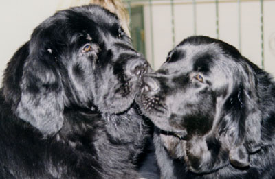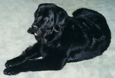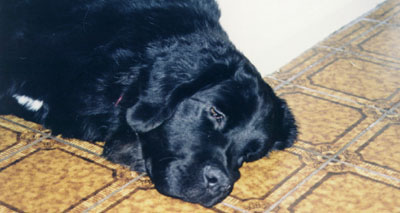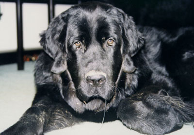 So many people have commented on how beautiful Cozy is, that I thought I would share some pictures of a real-world Newf. This is Cozy after playing in her favorite home-made mud puddle. Look carefully. The string of drool. The mud on her nose. The mud and much on her legs. Ah yes, my beautiful Cozy in all her glory. Cozy begging Daisy for some playtime. No matter what she's done during the day, when she sleeps, she becomes my little angel. I'm pretty sure she's dreaming of ways to torment Daisy though... Cosette is named for the character in Victor Hugo's famous novel Les Miserables. Perhaps you've seen the musical based on the book? Here Cosette gives us her rendition of "A Heart Full of Love" from the musical. Let me tell you, she really puts her heart into it. Cozy laying down, being a good girl, no doubt having been told repeatedly to do so. Hey, what's a Cozy update without a profile shot right? Thus endeth this installment of Cosette's page. Cosette's Home Page Back to the World of GAD Be Well, Be Strong.