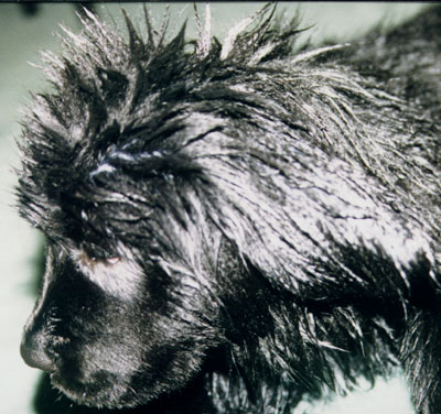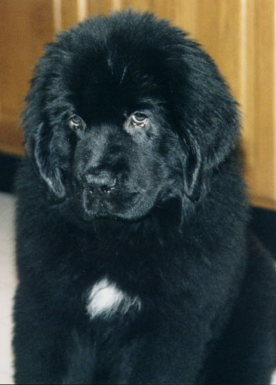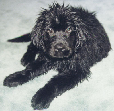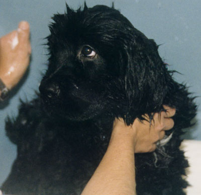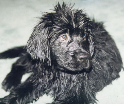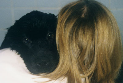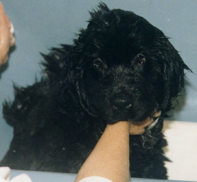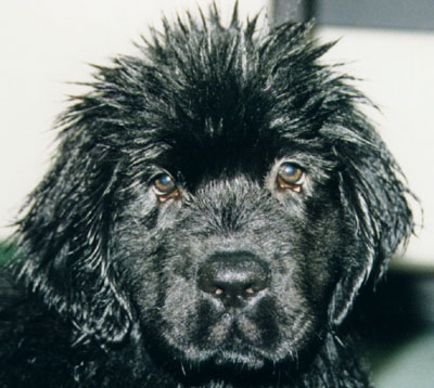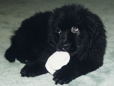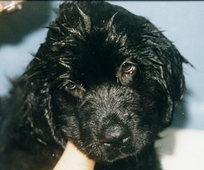 Well, to put it simply, Cozy did not enjoy her bath. She was very good and did not whimper, cry or bark. She just stood there and gave us this look continuously. I felt like we were torturing her. So then she looks at me as if to say "Please daddy, make her stop". BTW, she does not have my wife's whole hand in her mouth, it just looks that way. I think the reason our little Cozy was so unhappy was because my wife was spiking her hair up all along her back to make her look like Otto, our long lost Iguana. Don't worry Cozy, I won't let mommy put antlers on you during the holidays Of course hugs from mommy make anyone feel better. We always remark on how portly our little Newfie is. When she was wet she looked like she lost 40 pounds. She looked like a little dog all of a sudden. Maybe that's why she was unhappy. Once she got out of the tub and we toweled her off, she went berzerk. She went running like a maniac all over the house, apparently overjoyed at having been freed from her ordeal. Can you see the mischief in her eyes? Personally, I think the punk look is out, but who's to tell a Newfie about style? Quite shiny when wet no? I'm not sure there is anything I could say to make this picture more appealing. -Sigh- OK, I'll be good, you can trust me... Socks? What socks? Oh... these? Uh.. I was just... guarding them for you. Yeah. I did good right? OK, I'm clean, I'm being good, I put your socks away. Don't you think I deserve a cookie? Aren't I cute enough? (She got the cookie) Thus endeth this installment of the Newf puppy page. Cosette's Home Page Be Well, Be Strong.