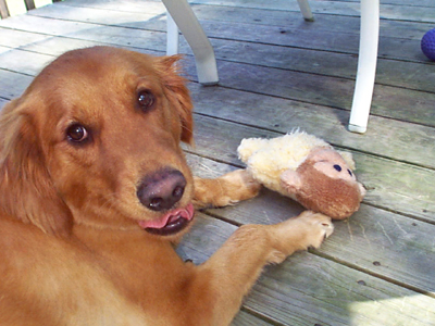 OK, so this isn't Daisy. It's Kirby! Kirby is my boss' Golden Retriever. He was staying with us for the weekend so he didn't have to go back to the scary kennel. (He didn't like it there, though I hear it's quite nice). Kirby is pictured here with a stolen Newfie toy.